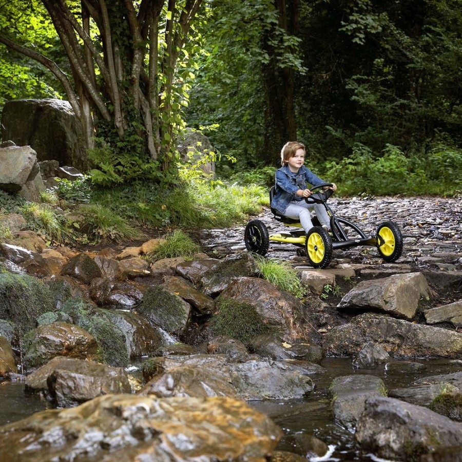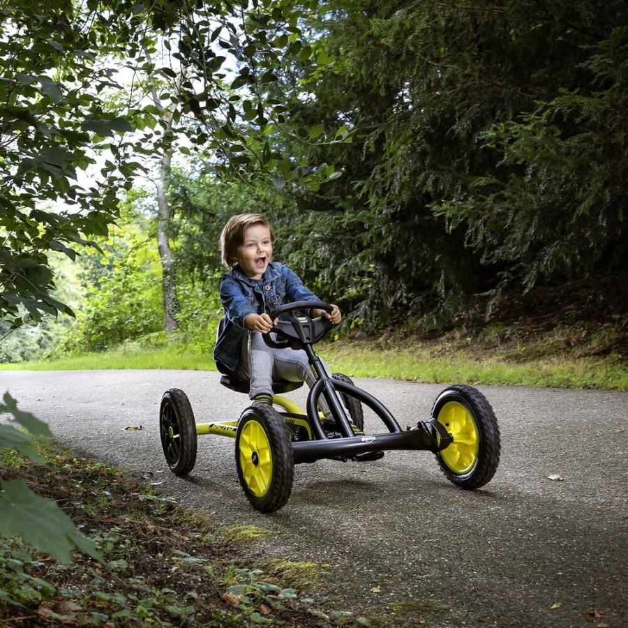 Dank der Pendelachse bist du mit dem BERG Buddy stabil unterwegs. Und das Fahren ist mit dem BFR-System ein Kinderspiel! Das Kind kann nämlich mit den Pedalen bremsen, aber auch sofort nach dem Anhalten rückwärts fahren. Lenkrad und Sitz sind verstellbar, wodurch sich der BERG Buddy einfach an die Größe des Kindes anpassen lässt. Dieser Pedal-Gokart ist für Kinder von 3 bis 8 Jahren geeignet.