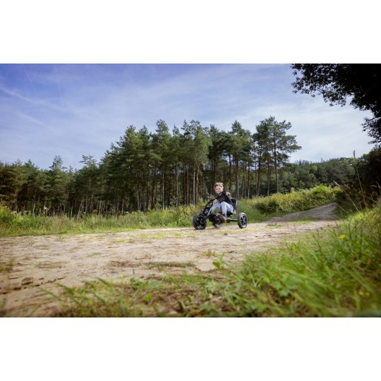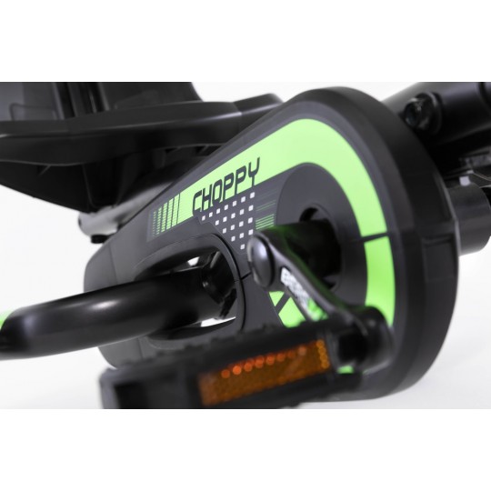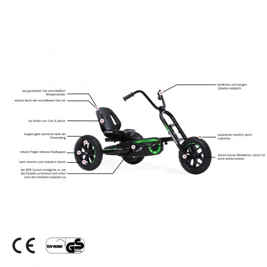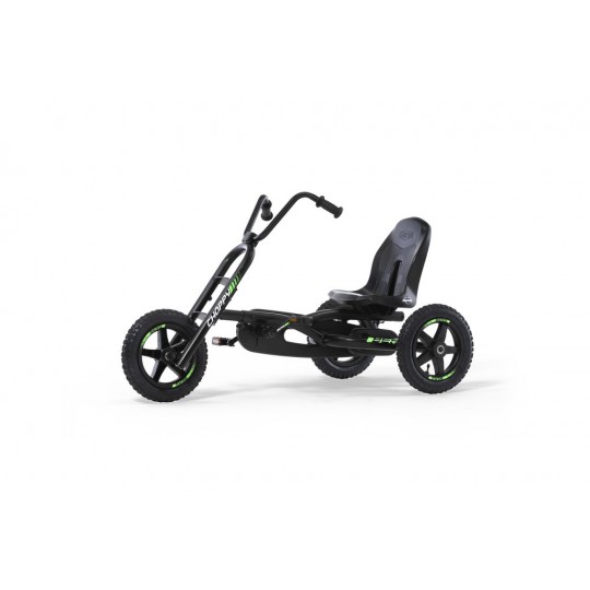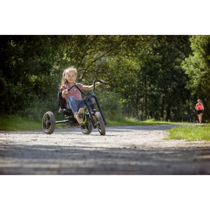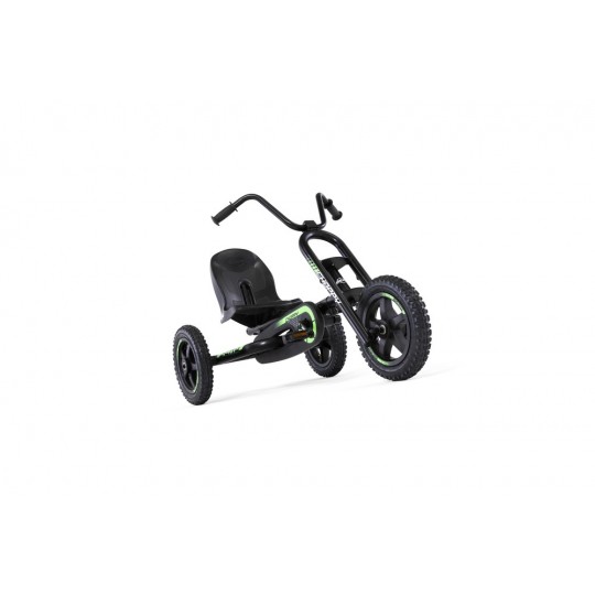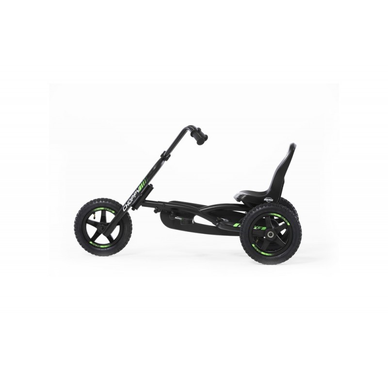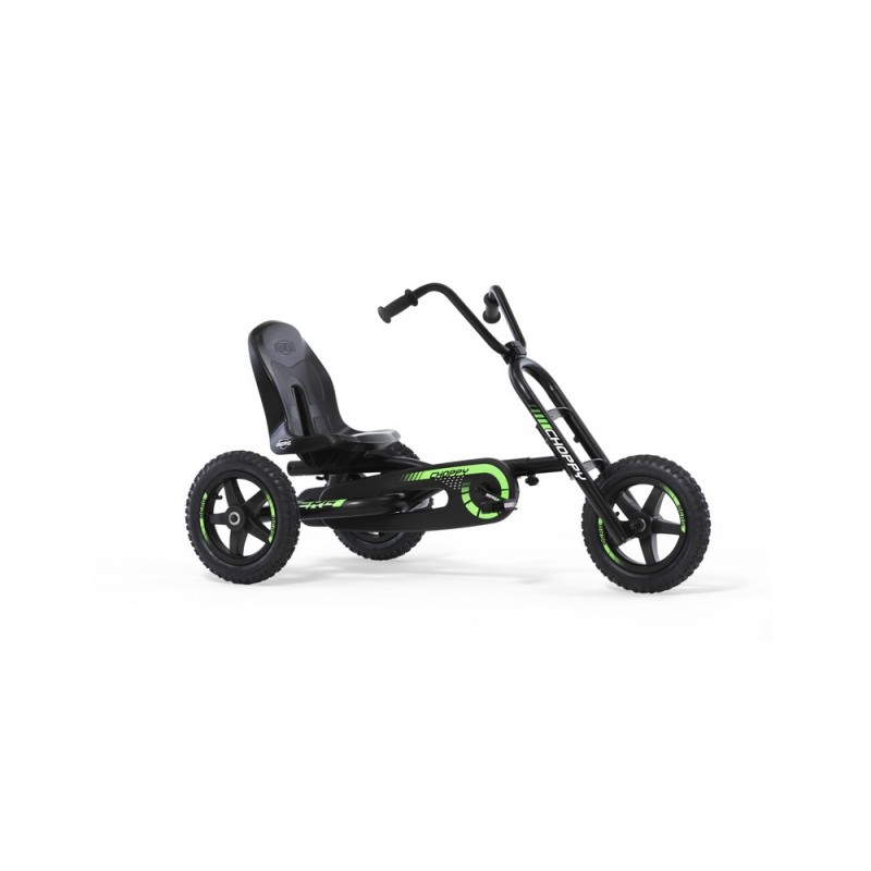 Der BERG Choppy NEO ist der jüngste Spross auf Basis der Choppy-Plattform. Cooles Schwarz, Off-Road-Reifen und hippe grafische Akzente machen den NEO zu einer eindrucksvollen Erscheinung. Zusammen mit dem Motorradlenker bist du der König der Straße! Der Choppy NEO hat ein einzelnes Vorderrad, wie bei einem Motorrad. Das macht den Pedal-Gokart enorm wendig. Mit dem BFR-System ist es ganz einfach, aus der Vorwärtsfahrt zu bremsen und sofort rückwärts weiterzufahren. Auf diese Weise kann das Spielen endlos fortgesetzt werden. Natürlich verfügt der Choppy NEO auch über komfortable Luftreifen und einen leicht verstellbaren Sitz, damit alle Kinder mit ihm Spaß haben können.